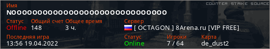 Играет на Counter Strike Source сервере. Страна: РоссияПервый раз замечен 21:44 15.12.2020