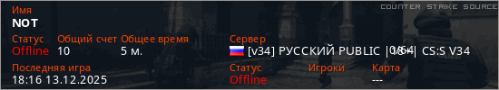 Играет на Counter Strike Source сервере. Страна: РоссияПервый раз замечен 18:14 13.12.2025
