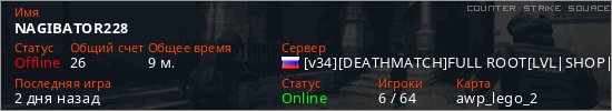 Играет на Counter Strike Source сервере. Страна: РоссияПервый раз замечен 22:54 17.10.2025