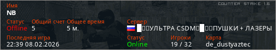 Играет на Counter Strike 1.6 сервере. Страна: РоссияПервый раз замечен 22:37 08.02.2026