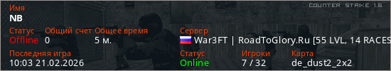 Играет на Counter Strike 1.6 сервере. Страна: РоссияПервый раз замечен 10:01 21.02.2026