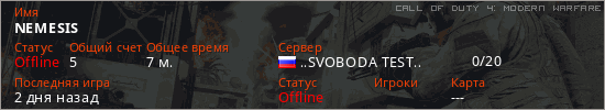 Играет на Call of Duty 4: Modern Warfare сервере. Страна: РоссияПервый раз замечен 21:52 03.12.2025
