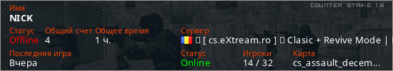 Играет на Counter Strike 1.6 сервере. Страна: РумынияПервый раз замечен 01:57 13.01.2025
