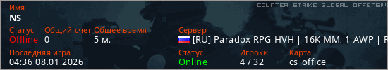 Играет на Counter Strike Global Offensive сервере. Страна: РоссияПервый раз замечен 03:32 08.01.2026