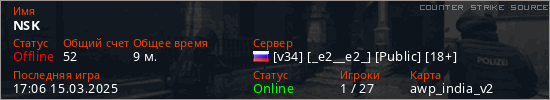 Играет на Counter Strike Source сервере. Страна: РоссияПервый раз замечен 15:29 15.03.2025