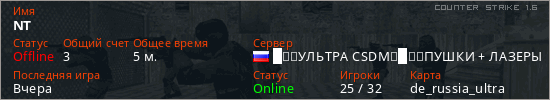 Играет на Counter Strike 1.6 сервере. Страна: РоссияПервый раз замечен 09:47 26.04.2026