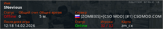 Играет на Counter Strike 1.6 сервере. Страна: РоссияПервый раз замечен 12:16 14.02.2026