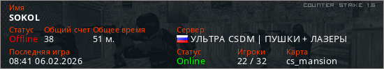 Играет на Counter Strike 1.6 сервере. Страна: РоссияПервый раз замечен 22:03 22.01.2026