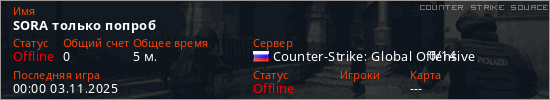 Играет на Counter Strike Source сервере. Страна: РоссияПервый раз замечен 23:34 02.11.2025