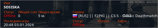 Играет на Counter Strike Source сервере. Страна: РоссияПервый раз замечен 19:58 03.01.2026