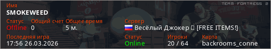 Играет на Team Fortress 2 сервере. Страна: РоссияПервый раз замечен 17:45 26.03.2026