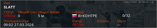 Играет на Counter Strike 1.6 сервере. Страна: РоссияПервый раз замечен 09:00 27.03.2026