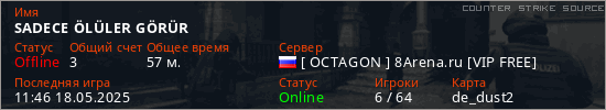 Играет на Counter Strike Source сервере. Страна: РоссияПервый раз замечен 21:18 22.04.2025