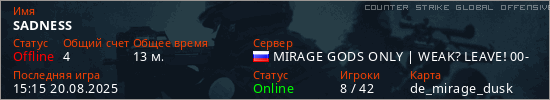 Играет на Counter Strike Global Offensive сервере. Страна: РоссияПервый раз замечен 14:32 20.08.2025
