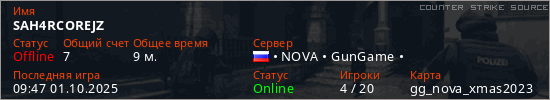 Играет на Counter Strike Source сервере. Страна: РоссияПервый раз замечен 09:08 30.09.2025
