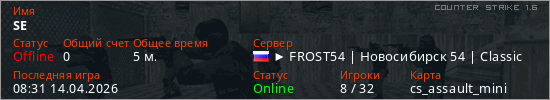 Играет на Counter Strike 1.6 сервере. Страна: РоссияПервый раз замечен 08:29 14.04.2026