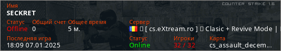 Играет на Counter Strike 1.6 сервере. Страна: РумынияПервый раз замечен 18:05 07.01.2025