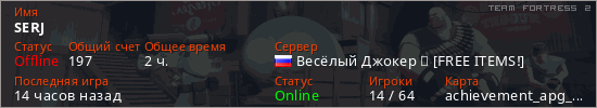 Играет на Team Fortress 2 сервере. Страна: РоссияПервый раз замечен 15:04 19.03.2026