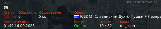 Играет на Counter Strike 1.6 сервере. Страна: РоссияПервый раз замечен 21:49 15.09.2025