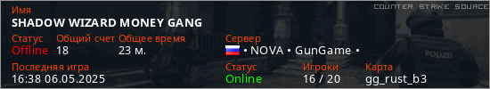 Играет на Counter Strike Source сервере. Страна: РоссияПервый раз замечен 09:27 22.01.2025