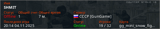 Играет на Counter Strike 1.6 сервере. Страна: РоссияПервый раз замечен 20:01 04.11.2025