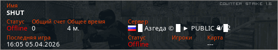 Играет на Counter Strike 1.6 сервере. Страна: РоссияПервый раз замечен 15:47 05.04.2026