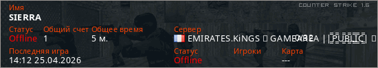 Играет на Counter Strike 1.6 сервере. Страна: ФранцияПервый раз замечен 14:04 25.04.2026