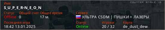 Играет на Counter Strike 1.6 сервере. Страна: РоссияПервый раз замечен 23:31 06.01.2025