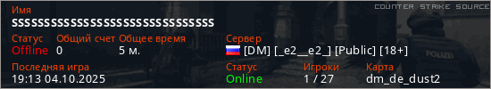 Играет на Counter Strike Source сервере. Страна: РоссияПервый раз замечен 18:59 04.10.2025
