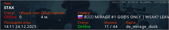 Играет на Counter Strike Global Offensive сервере. Страна: РоссияПервый раз замечен 14:07 24.12.2025