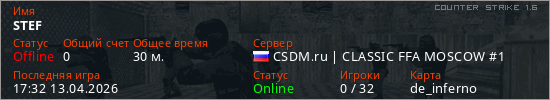 Играет на Counter Strike 1.6 сервере. Страна: РоссияПервый раз замечен 16:02 16.02.2026