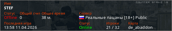 Играет на Counter Strike 1.6 сервере. Страна: РоссияПервый раз замечен 11:24 15.02.2026