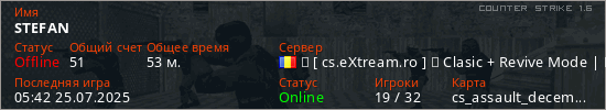 Играет на Counter Strike 1.6 сервере. Страна: РумынияПервый раз замечен 19:42 12.11.2024
