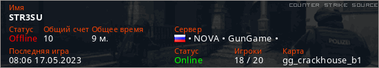 Играет на Counter Strike Source сервере. Страна: РоссияПервый раз замечен 11:23 01.05.2023