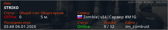 Играет на Counter Strike Source сервере. Страна: РоссияПервый раз замечен 03:46 06.01.2026