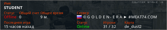 Играет на Counter Strike 1.6 сервере. Страна: РоссияПервый раз замечен 17:23 28.01.2026