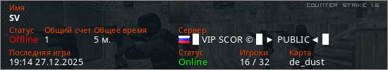Играет на Counter Strike 1.6 сервере. Страна: РоссияПервый раз замечен 19:12 27.12.2025
