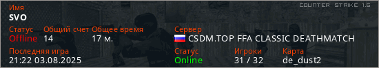 Играет на Counter Strike 1.6 сервере. Страна: РоссияПервый раз замечен 00:36 01.06.2025