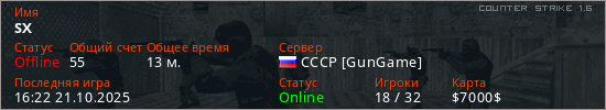 Играет на Counter Strike 1.6 сервере. Страна: РоссияПервый раз замечен 16:05 21.10.2025
