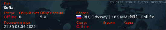 Играет на Counter Strike Global Offensive сервере. Страна: РоссияПервый раз замечен 21:31 03.04.2025