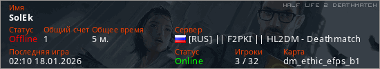 Играет на Half Life 2 DeathMatch сервере. Страна: РоссияПервый раз замечен 02:08 18.01.2026