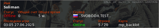 Играет на Call of Duty 4: Modern Warfare сервере. Страна: РоссияПервый раз замечен 02:51 27.06.2025