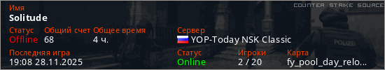 Играет на Counter Strike Source сервере. Страна: РоссияПервый раз замечен 19:03 30.06.2025