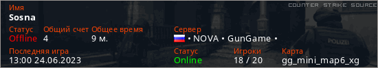 Играет на Counter Strike Source сервере. Страна: РоссияПервый раз замечен 18:31 08.04.2023
