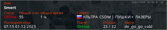 Играет на Counter Strike 1.6 сервере. Страна: РоссияПервый раз замечен 15:14 23.07.2025