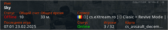 Играет на Counter Strike 1.6 сервере. Страна: РумынияПервый раз замечен 23:49 24.10.2024