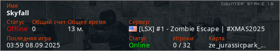 Играет на Counter Strike 1.6 сервере. Страна: СШАПервый раз замечен 05:16 06.08.2025