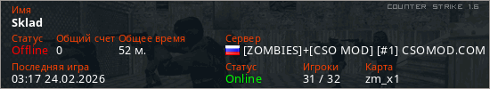 Играет на Counter Strike 1.6 сервере. Страна: РоссияПервый раз замечен 03:15 24.02.2026