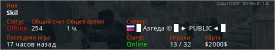 Последний раз был в сети 16 часов назад Игрок с таким ником замечен на 7 серверах