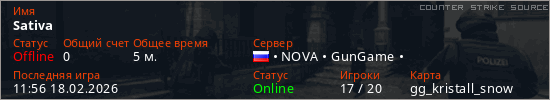Играет на Counter Strike Source сервере. Страна: РоссияПервый раз замечен 11:52 18.02.2026